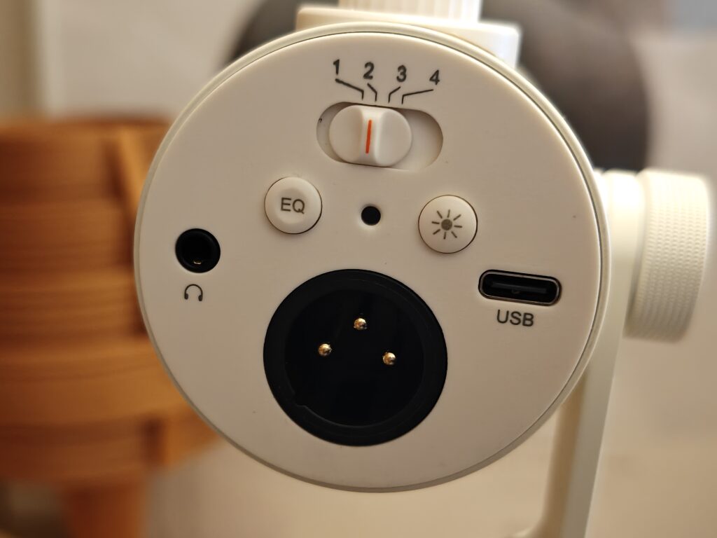 マイク裏側には外部デバイスとの接続端子、EQ変更やゲイン調整、RGBライトの選択ボタンがあります。