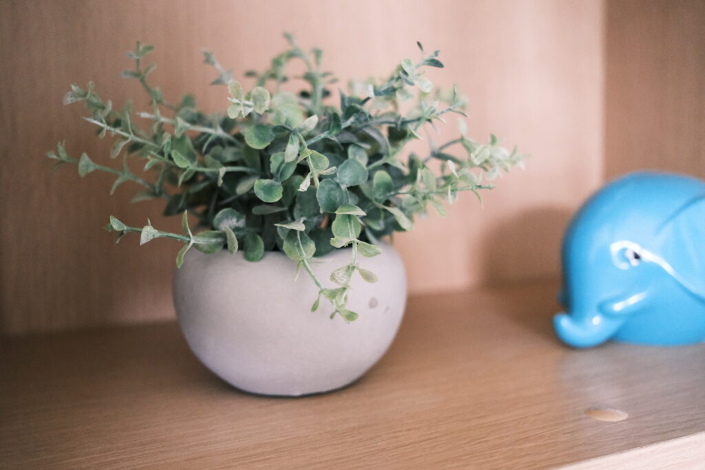 そこに植物の緑と、そして小さなブルーとオレンジの差し色となるような小物、柄を置いています。
