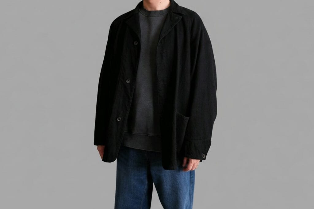 シルエットは肩がしっかり落ちてリラックス感がある。腕周りもたっぷりで通常のシルエットのモデルとは大きく異なる。
