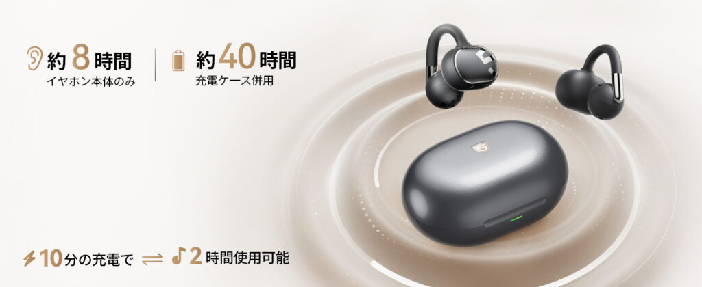 - 再生時間:イヤホン単体:最大8時間 ケース込み:最大40時間 ※急速充電10分で約2時間再生