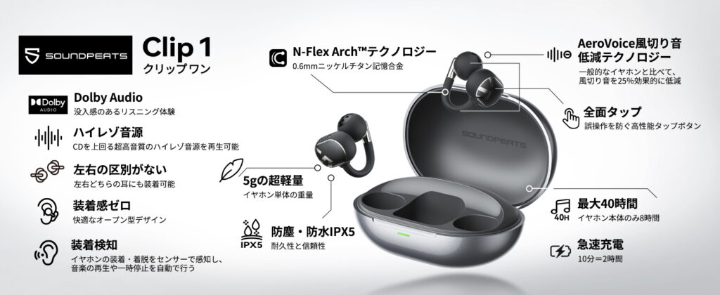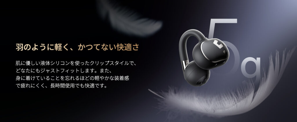 SOUNDPEATS Clip1は、その常識を覆す1台でした。イヤーカフ型で片耳約5gの軽量設計、LDAC対応によるハイレゾ再生、そして12mmの大口径ドライバーを搭載。軽快な装着感と迫力ある低音を両立しています。