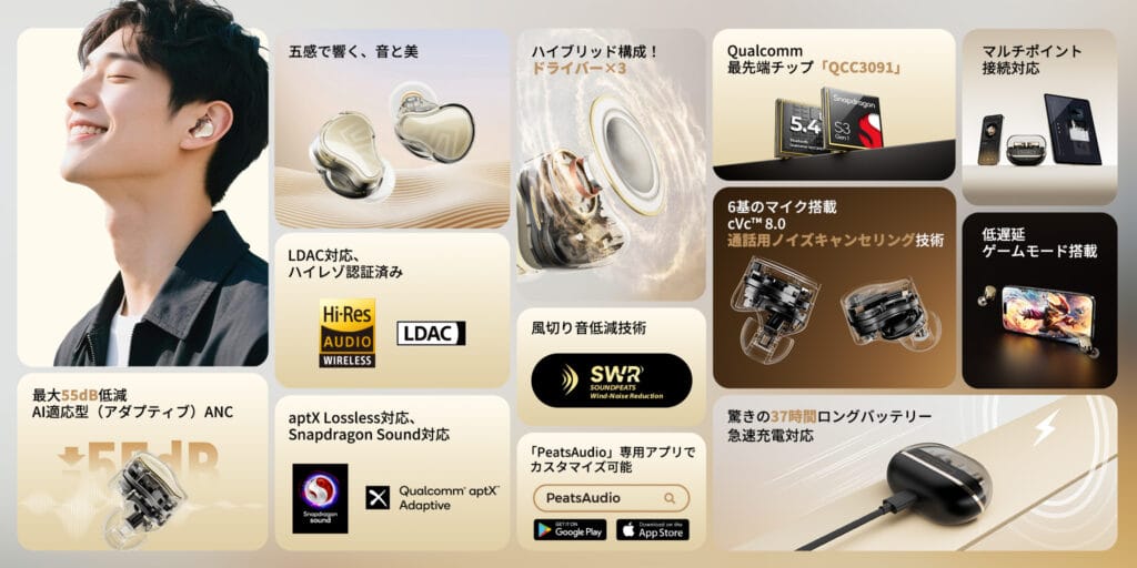 さらに、音質特化モデルながら、-55dB ANCに対応、IPX防水など、日常利用に必須な機能も兼ね備えています。